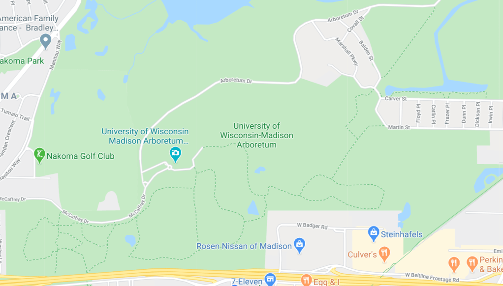 Opposite the capitol on Lake Monona, Oilin park has a collection of trails, my favorite of which is along the water to Turvilles Point. Also, a great starting point for the 11 mile lake loop around lake Monona if you want a long non nature bike ride or walk. Parking lots and bathrooms!