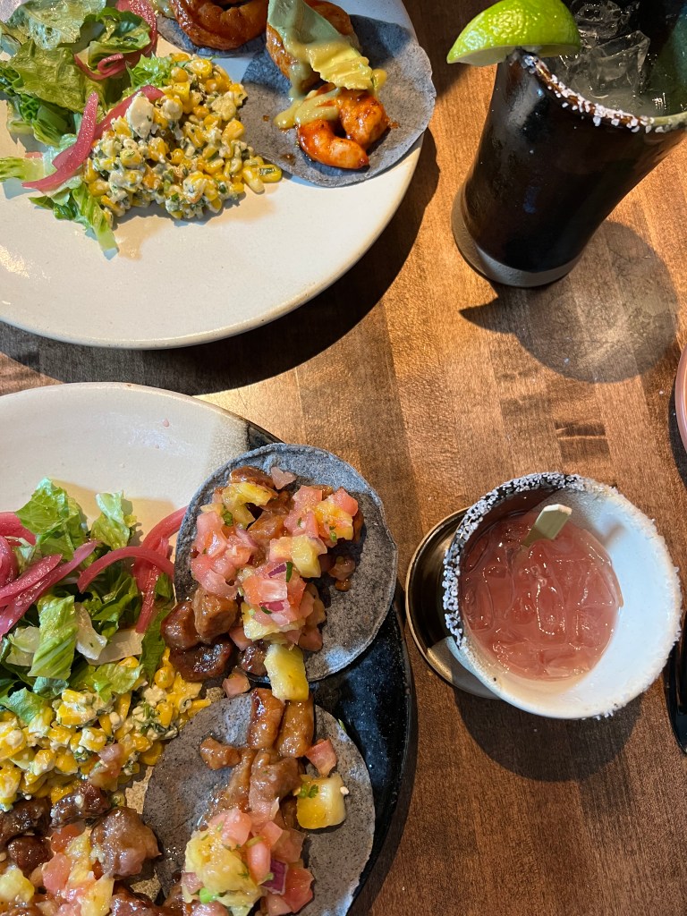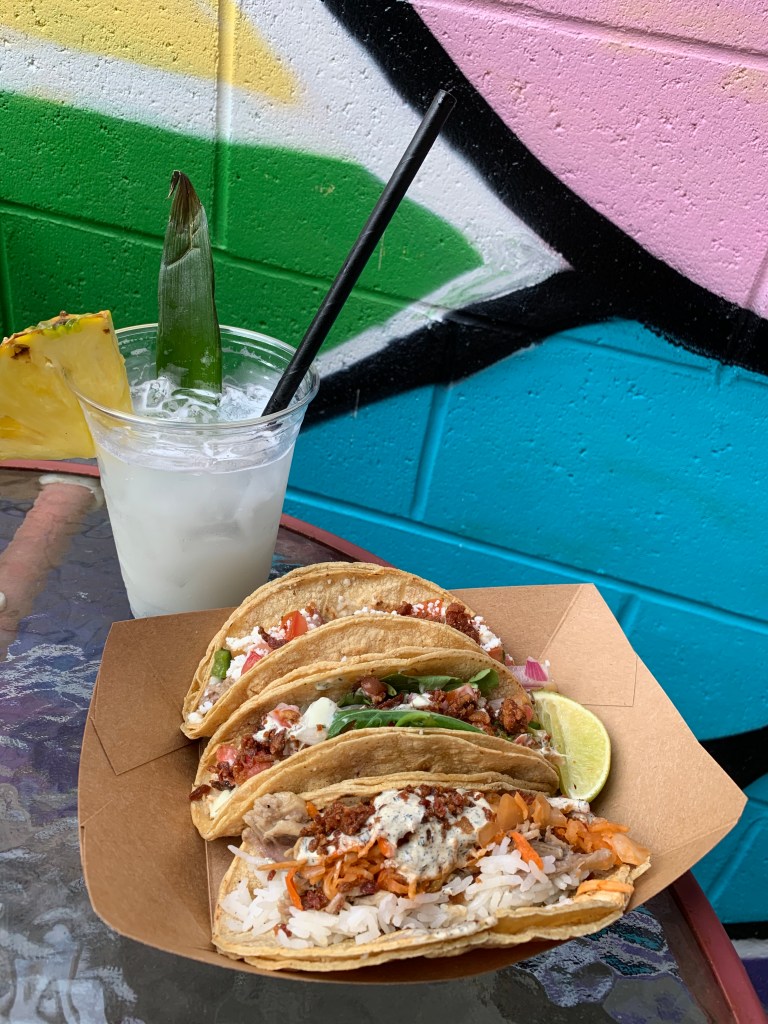 Hole in the wall bar with great tacos, street corn and drinks! Shown here: the Islander, PBR and X, with a pina colada. During corona, you order from the outside window and find a table or lawn spot.